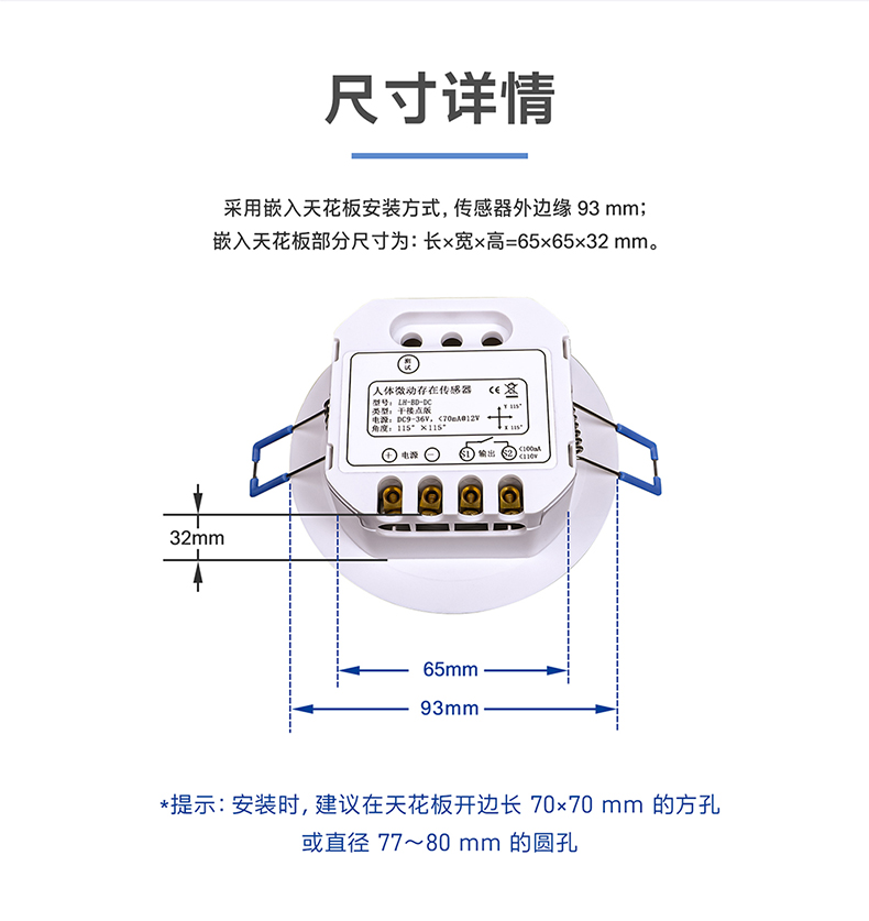 嵌入天花板安装;天花板上可开边长 70×70 mm 的方孔或直径 77~80 mm 的圆孔